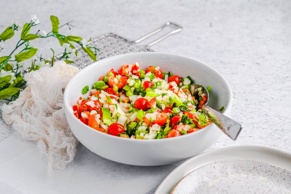 Wash and then slice the cherry tomatoes in half. Then, cut off the sides of the bell peppers. Slice the bell pepper into julienne pieces first, then, dice the bell pepper into very small dice. Do the same with the onion. Peel the outside of the onion, then cut it in half. Cut the onion into julienne and then into small dice. Place all the vegetables in a medium-sized mixing bowl.Step 2