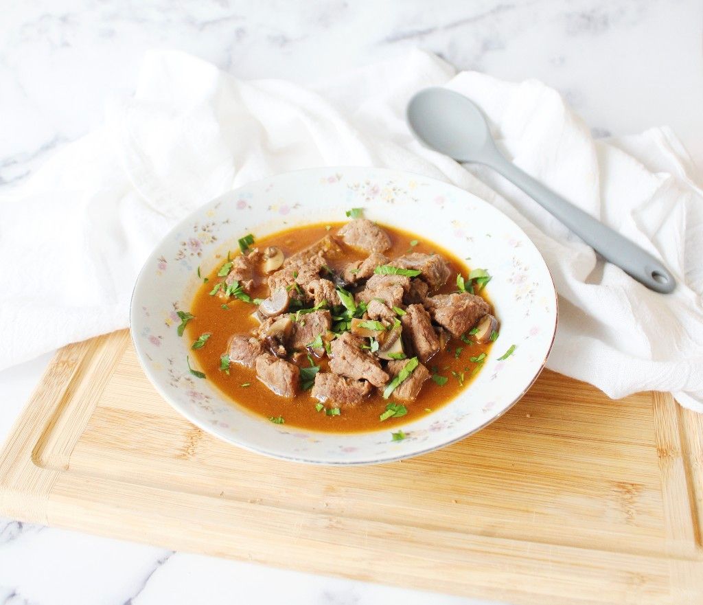 Next, reduce your heat to a low setting, then sprinkle the tapioca flour over the beef. Stir the beef around in the flour until the meat is coated and the flour starts to brown. Then, pour the beef broth into the pot. Stir and bring the pot to a simmer.Step 3
