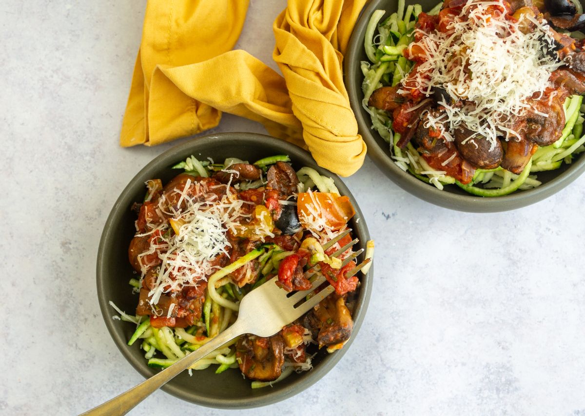 This vegetarian Keto dinner recipe is inspired by a classic bolognese - but with a veggie-friendly twist! Our Keto-friendly pasta is prepared with tender celery, onion and garlic, sliced mushrooms, fresh rosemary, black olives, chopped tomatoes, balsamic vinegar, vegetable stock and served over a bed of zucchini noodles. The spaghetti is then topped with grated hard Italian cheese to serve.