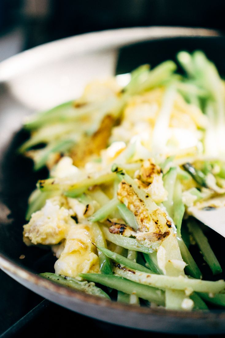 Push the chayote to the sides of the saute pan to create space in the center. Add the rest of the oil and the scrambled eggs.Step 5