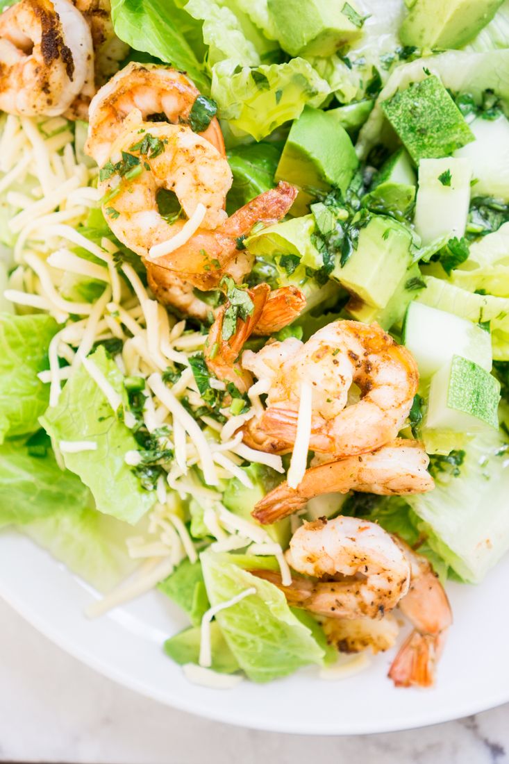 This Baja shrimp salad is bright and citrusy! The crunchy and crisp romaine lettuce is delicious with the Old Bay seasoned shrimp, creamy avocado, cool cucumber and spicy jalapeños! The salad is tied together with a cilantro-lime dressing