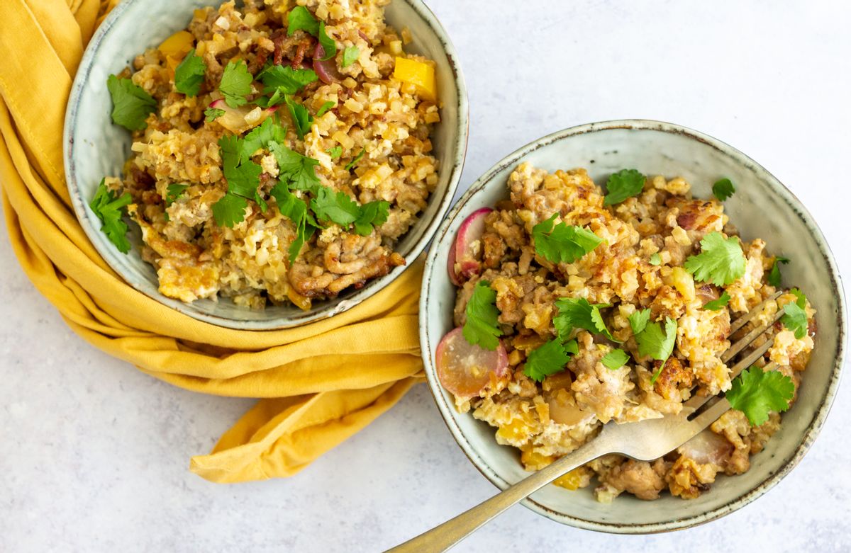 This tasty Keto pork recipe makes a delicious lunch or dinner option that the whole family can enjoy. Our low carb dish is prepared with ground pork, crisp radishes, juicy yellow bell pepper, aromatic scallions, cauliflower rice, zesty lime juice, tamari sauce, sesame oil, and beaten eggs. The recipe is pan-fried in just one pan - perfect for fuss-free cooking with minimal washing up!