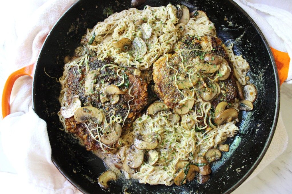 What says “comfort food” better than a skillet meal? Have a delicious Keto dinner for two ready to go in less than an hour! Classic smothered pork chops are given a Keto twist for the better by using a pork rind seasoned breading. After being fried to a crisp in avocado oil, they’re later smothered in a creamy mushroom sauce. To make this meal more filling, shirataki noodles are added into the skillet. These Keto noodles are excellent for a particularly special meal and mimic pasta gosh-darn-near perfectly! If you’re still finding yourself hungry, pair this heavy meal with a light salad or sauteed vegetable side dish. You’ll find many other Keto comfort food sides in the Carb Manager recipe database.