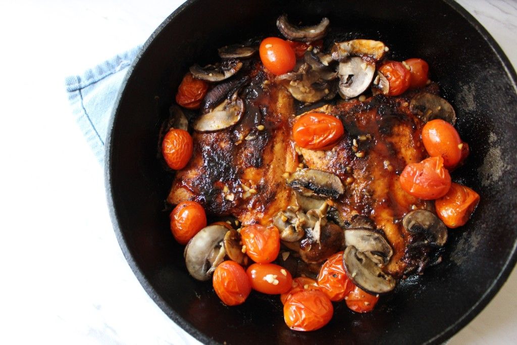 Pink salmon filets are packed with seasoning before cooked to a blackened crisp in your cast iron skillet. A spread of barbecue sauce adds an additional layer of flavor before it’s all baked in an oven with lightly seasoned veggies. Enjoy your salmon filets with tender mushrooms and bursted, hot tomatoes.