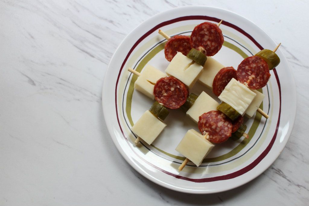 Create the skewers by arranging the ingredients on each one. Each skewer should have 2 pieces each of salami, pickle, and cheese.Step 3