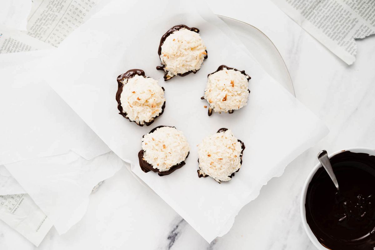 Unsweetened coconut is folded into a sweetened meringue mixture to hold the lovely coconut together into a cookie shape. Each cookie is scooped onto a silicone-lined baking sheet and baked until golden brown on the edges. Once the cookies are cooled, they are dipped into decadent dark chocolate. You can skip this step, but it makes them so pretty and delicious! These make an excellent low-carb dessert and pair perfectly with a Keto coffee.