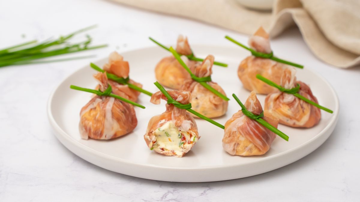 These cute little prosciutto parcels are stuffed with cream cheese, chives and sundried tomatoes.
