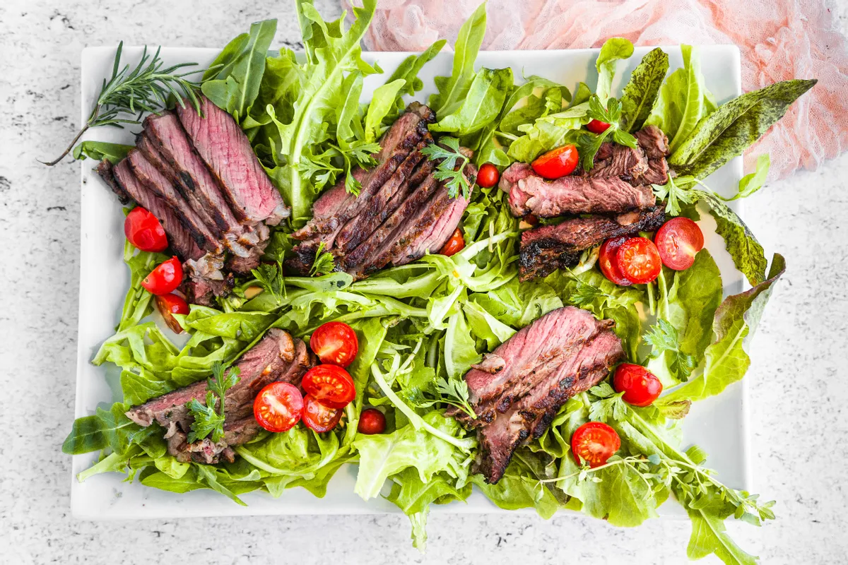 I love a delicious steak salad recipe! What’s even better is that this Keto OMAD recipe is so easy. OMAD doesn’t have to be complicated or have a lot of ingredients to it. Delicious beef ribeye steaks are seasoned with kosher salt on both sides. Then they are marinated in a mixture of olive oil and chopped herbs like parsley, rosemary, and thyme. A sprinkling of garlic powder is added too. The steaks are massaged and left to come to room temperature before hitting the grill. Feel free to substitute the herbs with your favorites! Once ready to serve, the steaks hit the grill to cook and get a delicious char. The steaks are thinly sliced and then topped on a bed of crispy arugula leaves and cherry tomatoes (feel free to use a spring mix instead). The salad is dressed with an apple cider vinaigrette (perfect to help with digestion after fasting)! More fresh herbs are added on top to make the salad pop. You will add this to your list of Keto OMAD recipes!