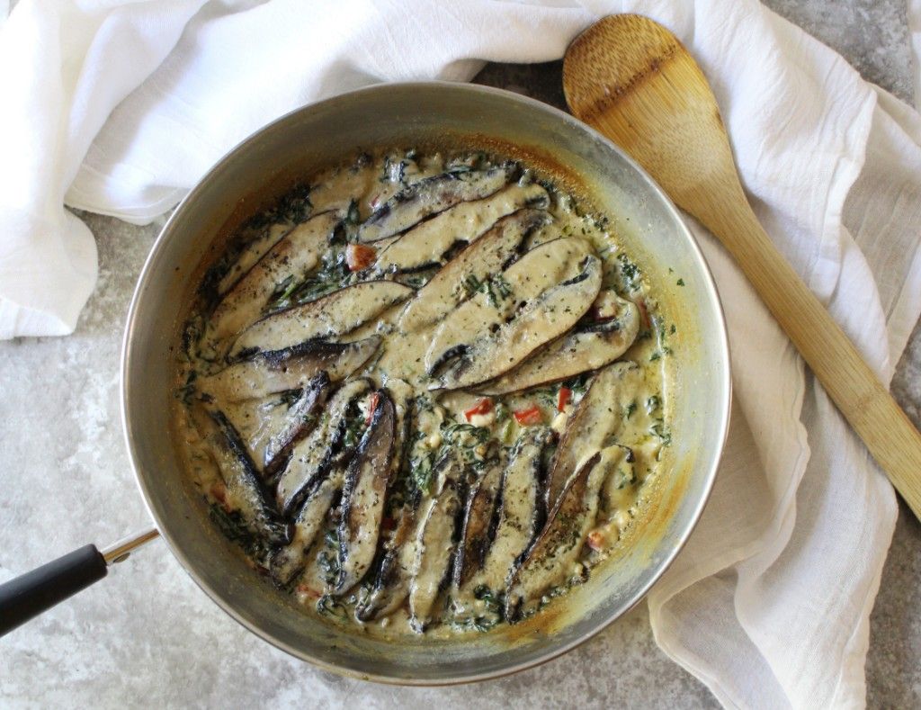 This totally vegetarian skillet is thick, rich, and creamy! Meaty portabella slices are browned in an oven before added to a skillet full of a tangy cream sauce. Fresh bell pepper and spinach add a little bite and texture to cut the creamy sauce.