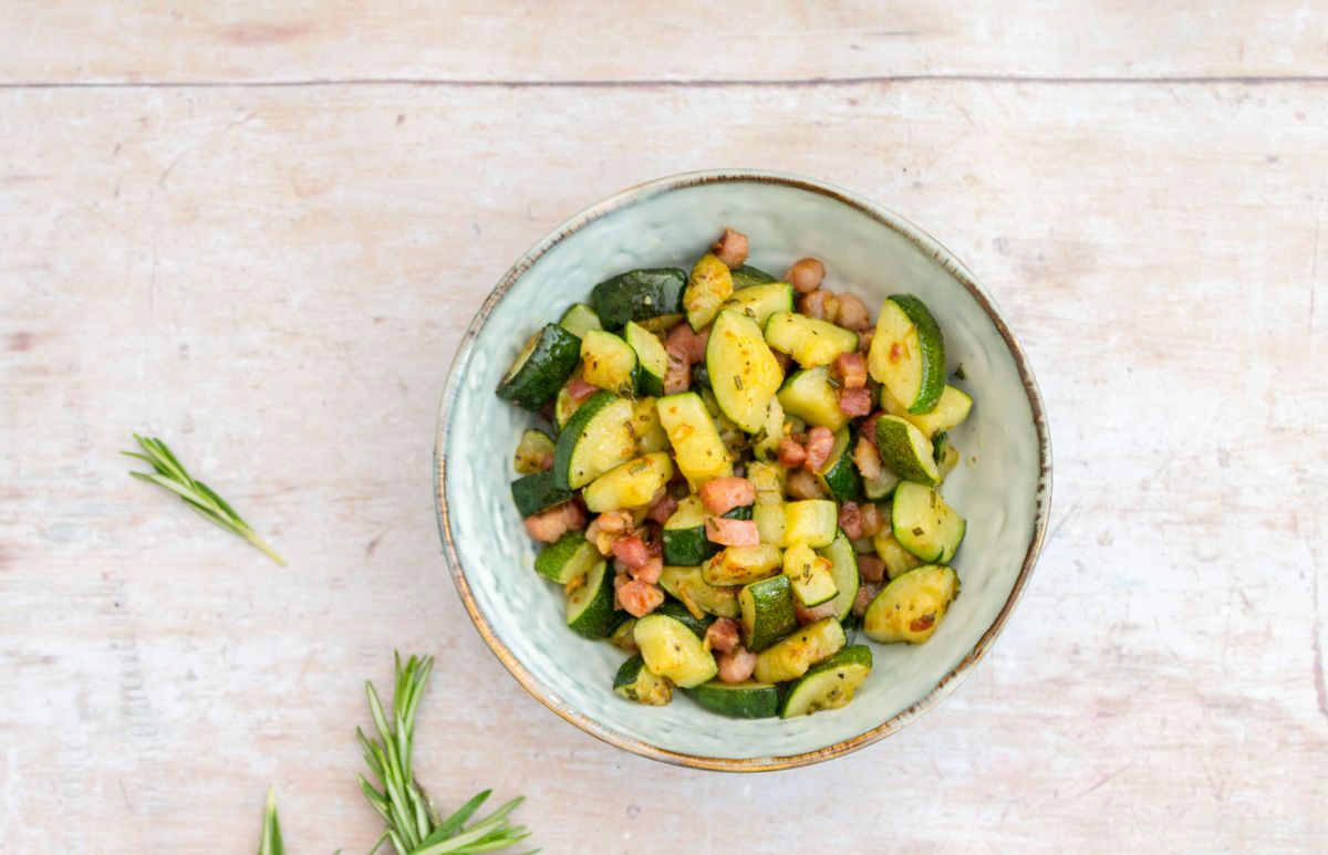This quick and easy zucchini dish is rich with salty pancetta, aromatic rosemary and garlic and zesty lemon.
