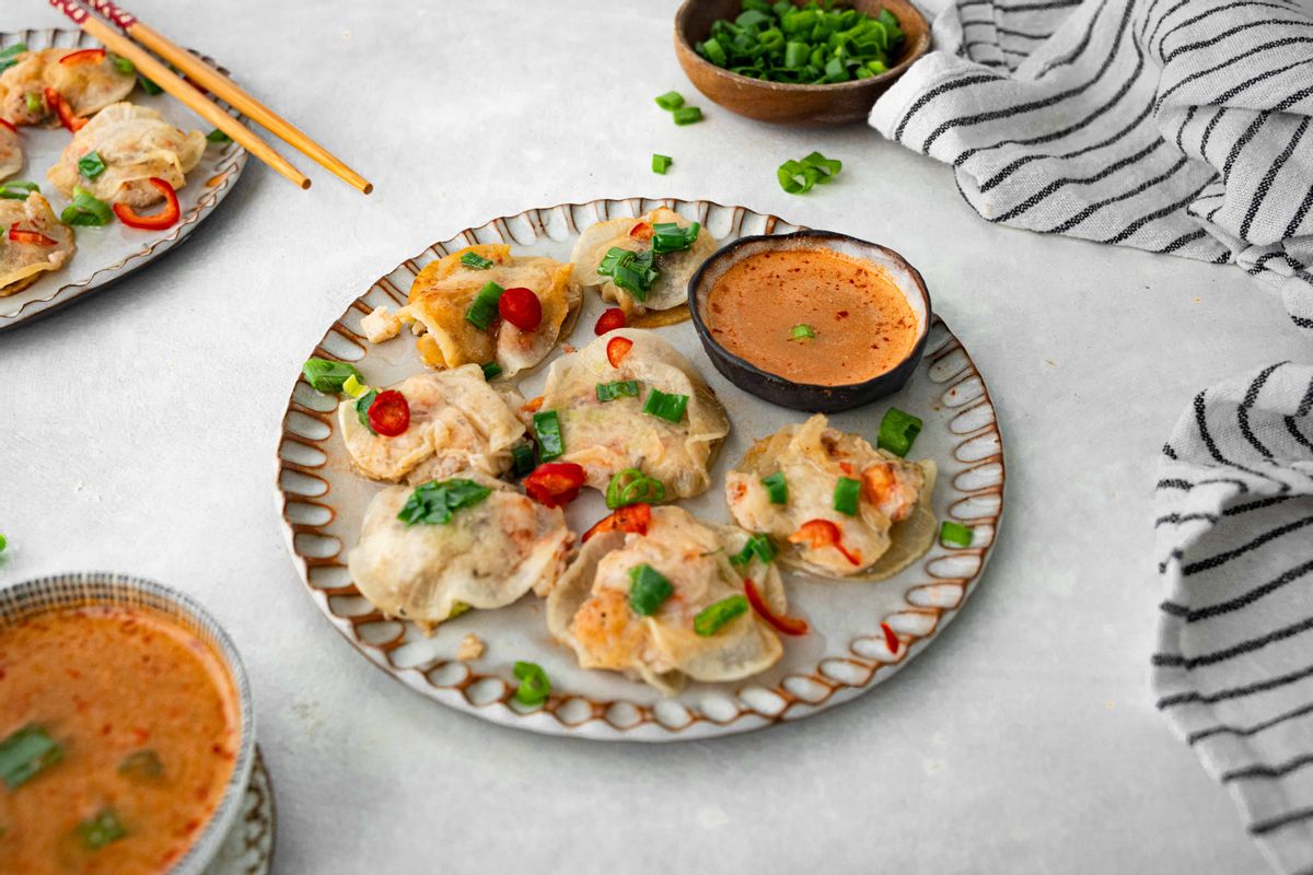 Take the dumplings out of the skillet and place them on a serving plate. To make the dipping sauce, whisk 4 tbsp of water, 2 tbsp of granulated erythritol, 2 tbsp of fish sauce, 2 minced garlic cloves, and 1 tsp crushed red pepper in a bowl. Transfer to small sauce bowls.Step 8