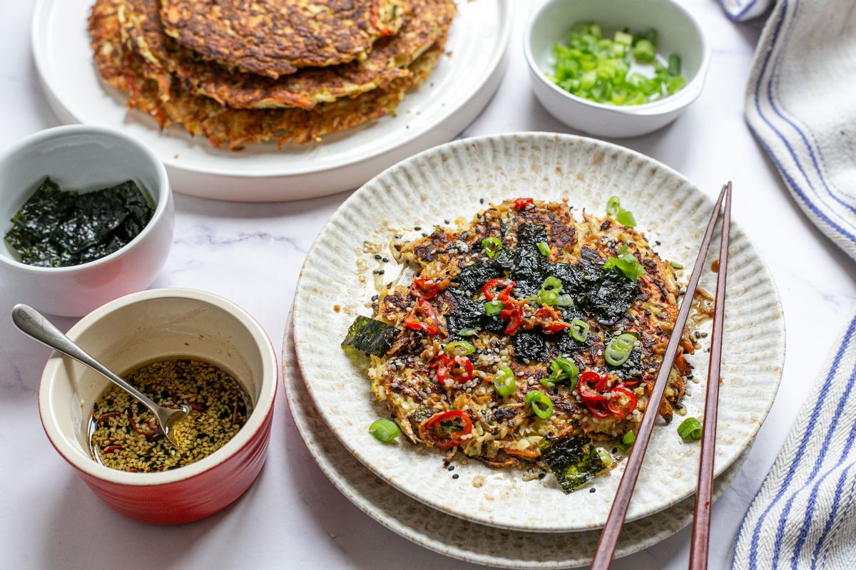 Heat a large nonstick frying pan set over medium-high heat. Coat the entire base of the pan with the remaining sesame oil. Scoop large spoonfuls of the vegetable mixture into the pan and press down with a flat spatula to form a pancake.Step 4