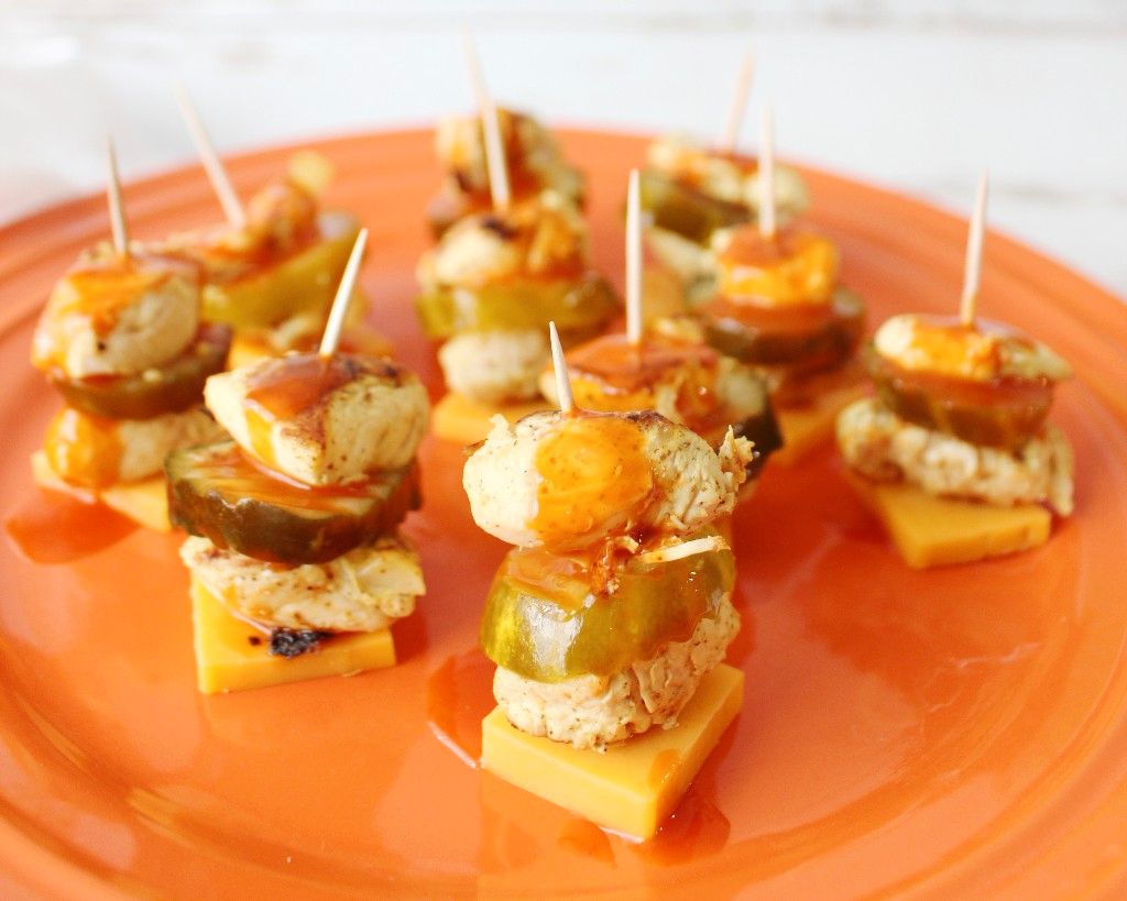 Give the chicken time to cool - at least 15 minutes. Grab your pickle chips, and cut the cheddar cheese into ⅛-inch thick squares. Use toothpicks to make each stack and include two pieces of chicken, a pickle chip, and a piece of cheese. Drizzle about ¼ teaspoon of hot sauce over the stack to serve.
