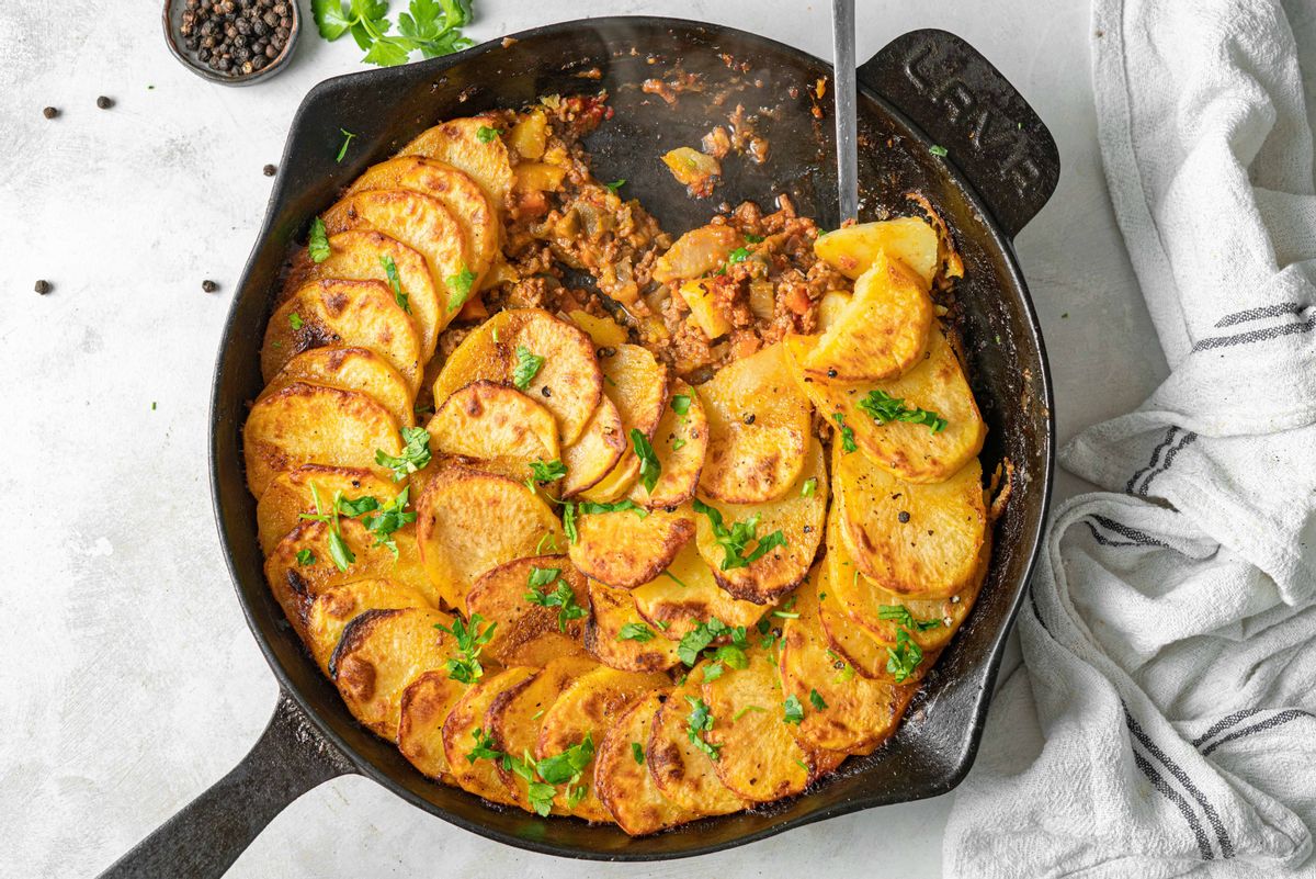To the beef center, you can try adding any aromatic vegetables like leeks or mushrooms. As for the crispy potato top, you can swap the potatoes for squash, rutabaga, or kohlrabi. You can also flavor the recipe with a mixture of fresh or dried herbs and spices adjusted to your liking. Thyme and rosemary are classics, and feel free to add a hint of chili flakes if you like a bit of spice. If you’re unsure about the spice, you can always add it to your bowl after serving to try.