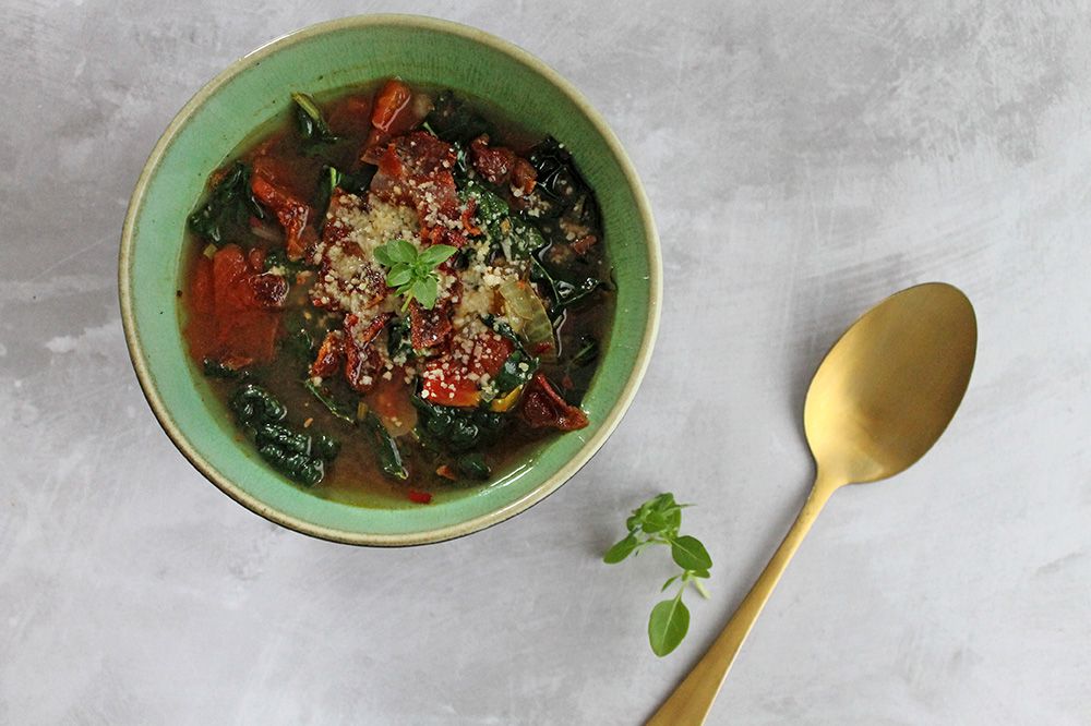 This kale soup is rich with Italian flavours and finished with a topping of crisp bacon and tangy Parmesan.