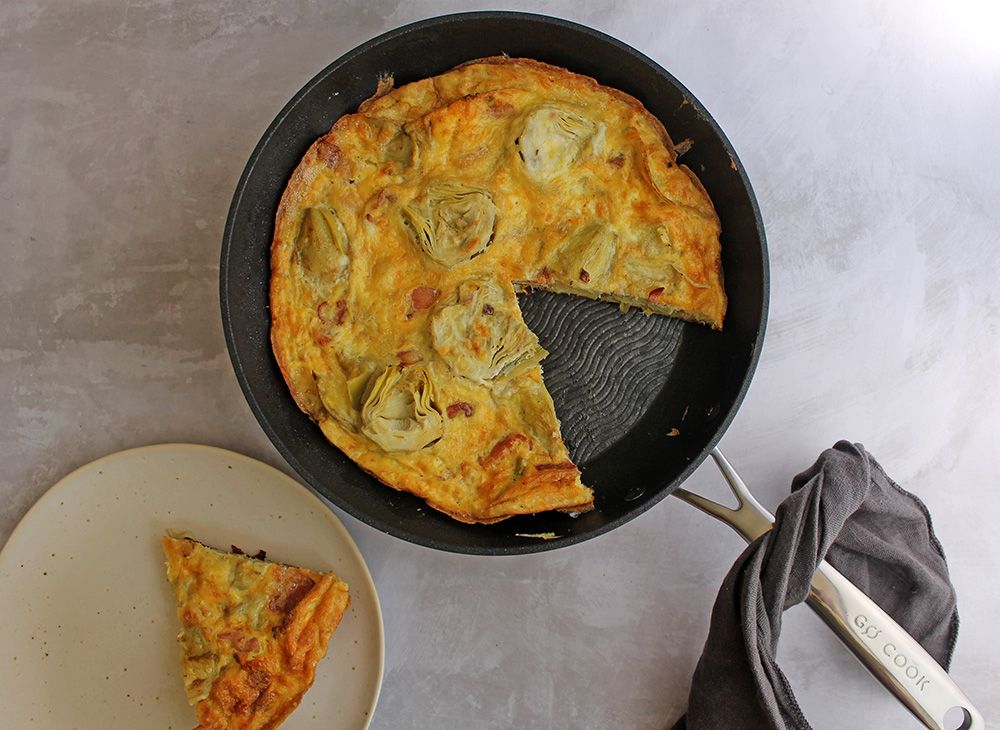 This rich and tasty omelette is loaded with salty bacon, tender artichokes and tangy cheddar cheese.
