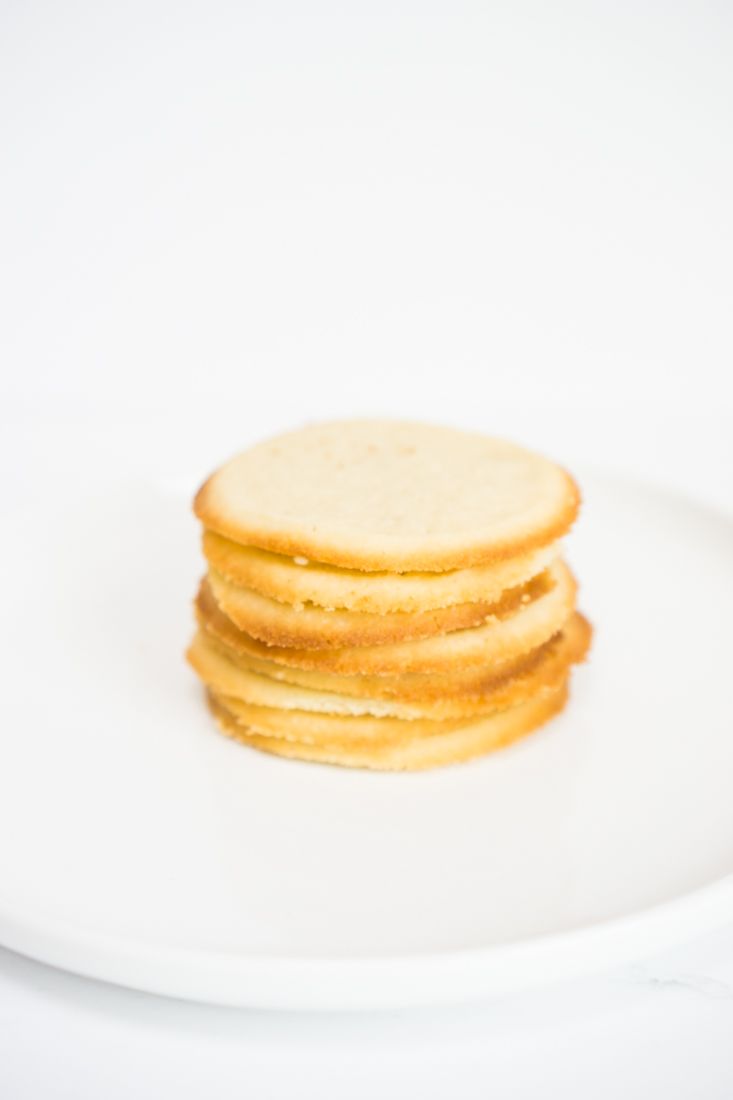 Cut cookies with a 2 ½” round cookie cutter. Use a spatula to scrape the cookie shapes off the parchment paper. If the dough starts to scrunch up, the dough needs to be frozen again for 10 minutes before continuing. Place cookies on a parchment lined baking sheet 2” a part and freeze them for 10 minutes before baking at 350 F. Bake for about 10 minutes, rotating the pan halfway through the baking time. Bake until lightly golden on the edges. Allow the cookies to cool on baking sheet until ready to handle, transferring them to cooling rack.