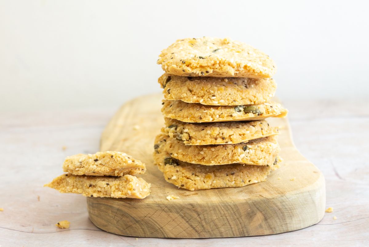 These crunchy vegan Keto biscuits are packed with healthy seeds and just a hint of ‘cheese’ flavor. Our low carb plant-based snack is prepared with ground almonds, coconut oil, a touch of low carb sweetener, crunchy chia seeds, pumpkin seeds, sesame seeds, and nutritional yeast. Once prepared, the biscuits are oven-baked until lightly golden, then left to cool completely and firm.