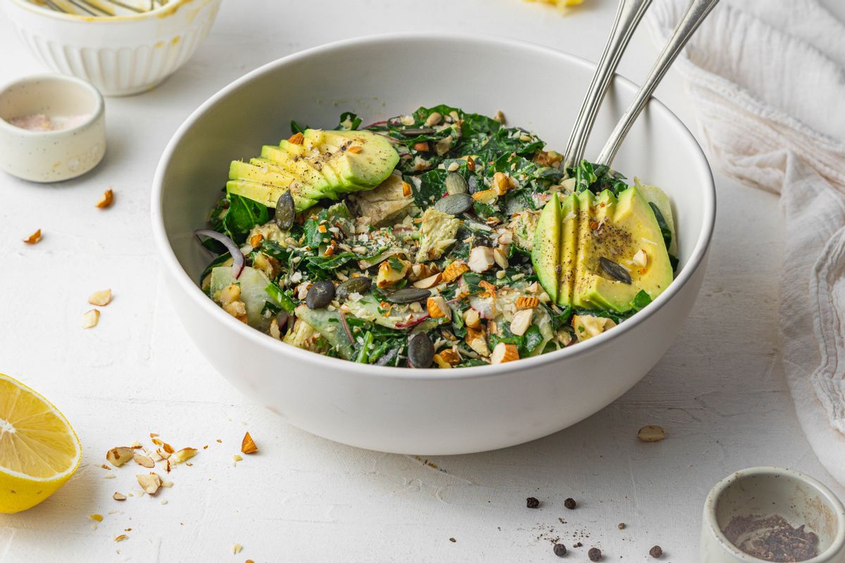Remove the ribs from the kale and chop it into bite-sized pieces. Chop the cooked chicken breast into bite-sized pieces. Thinly slice the red onion, radish, and avocado. Roughly chop the almonds, walnuts, and fresh parsley. Sprinkle the chopped kale with salt and drizzle with 1 teaspoon of olive oil. Massage the kale with your hands until it softens and darkens in color.Step 4