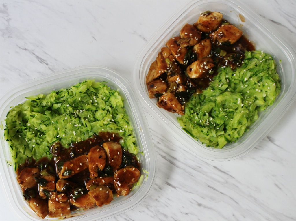 This meal prep recipe can easily be double to fulfill a week a meal prepping! Chopped chicken is coated in a delicious sauce flavored with toasted sesame seeds, garlic, and a smidgen of peanut butter. A side of cooked zucchini is a low carb filler-upper. You won’t even miss the takeout!