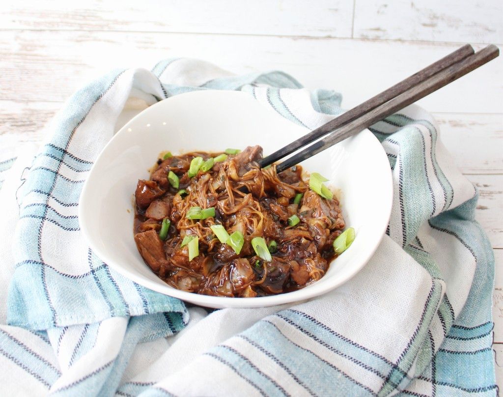 Shirataki noodles are made from yam flour and lots of water. That’s why they’re so low-carb! Shirataki noodles can be found packaged in water and kept in a refrigerated section at the grocery store. They can also be packaged in a dry setting in a gluten-free aisle, but you may need to prepare this type of shirataki noodles before using them in the lo mein recipe.