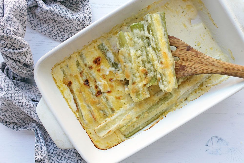This simple yet flavorsome recipe takes low carb celery and bakes it in an oozy cheese sauce.