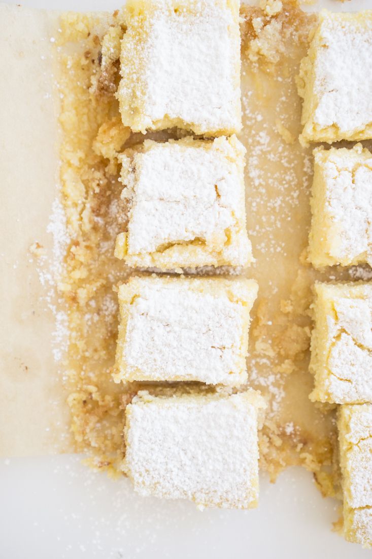 Pour the prepared lemon filling onto the cooled almond crust and return to the oven to bake for 21-23 minutes. The center should jiggle slightly but jiggle all together with the rest of the lemon filling. If you overbake, it will crack. It will still be delicious, however. Allow the bars to cool in the refrigerator for several hours until firm enough to cut into squares. Dust with additional powdered erythritol using a small sieve to decorate. Keep stored in the fridge until ready to serve.
