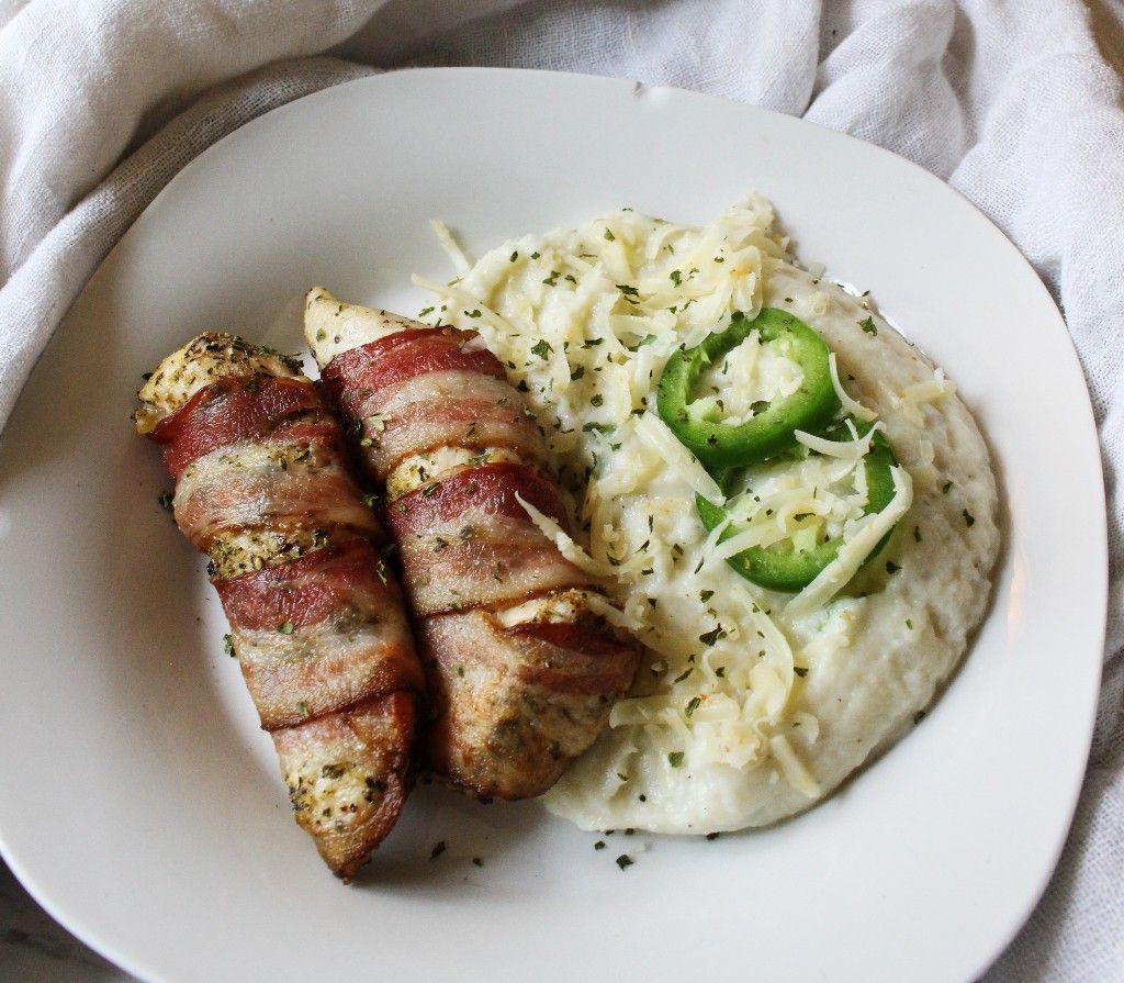 Low Carb Bacon Wrapped Ranch Chicken w Jalapeno Pepper Jack Mashed Cauliflower