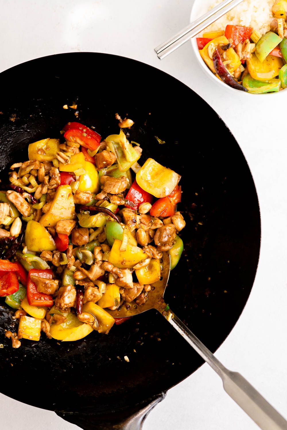 Delicious, succulent chicken thighs are diced up and marinated in a mixture of salt, soy sauce, and sherry wine; they are then stir-fried in toasted dried chilies, garlic, and ginger. The chicken is then tossed into stir-fried green, red, and yellow bell peppers as well as sliced celery and toasted salted peanuts. This is Keto Chinese food at it’s finest! The final dish is then glazed with a sauce made with dark soy sauce, soy sauce, Chinkiang vinegar, and sesame seed oil. You will want to add this to your list of low carb Chinese recipes.