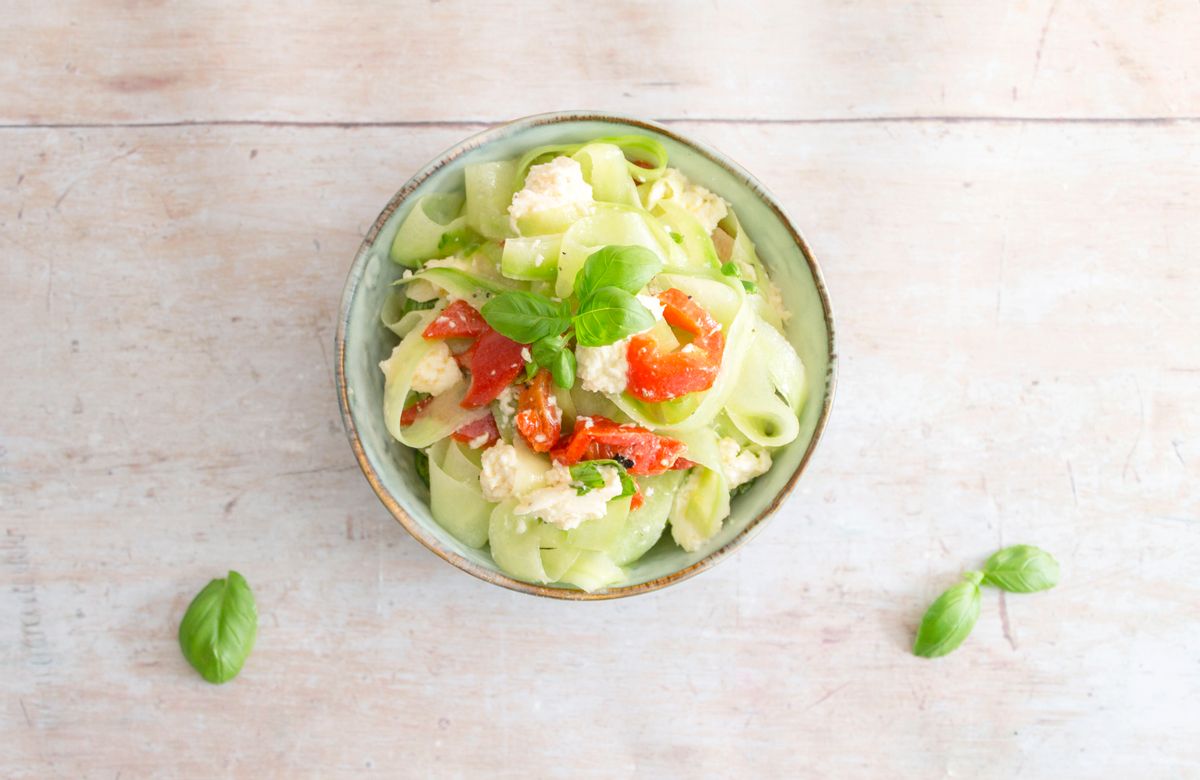 Tear the mozzarella into bite sized chunks and roughly chop the pepper and basil. Add to the bowl along with the cucumber noodles, black pepper and olive oil. Toss to combine.