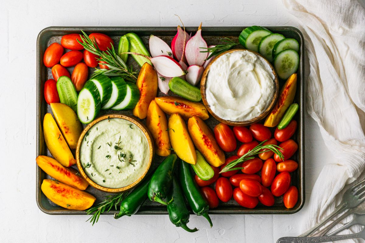 Slice the cucumber into thick slices, deseed and slice the peaches into slices and cut the radishes into halves. Place the dips on a serving tray and add the chopped vegetables and fruits around the dips as you like. Enjoy immediately