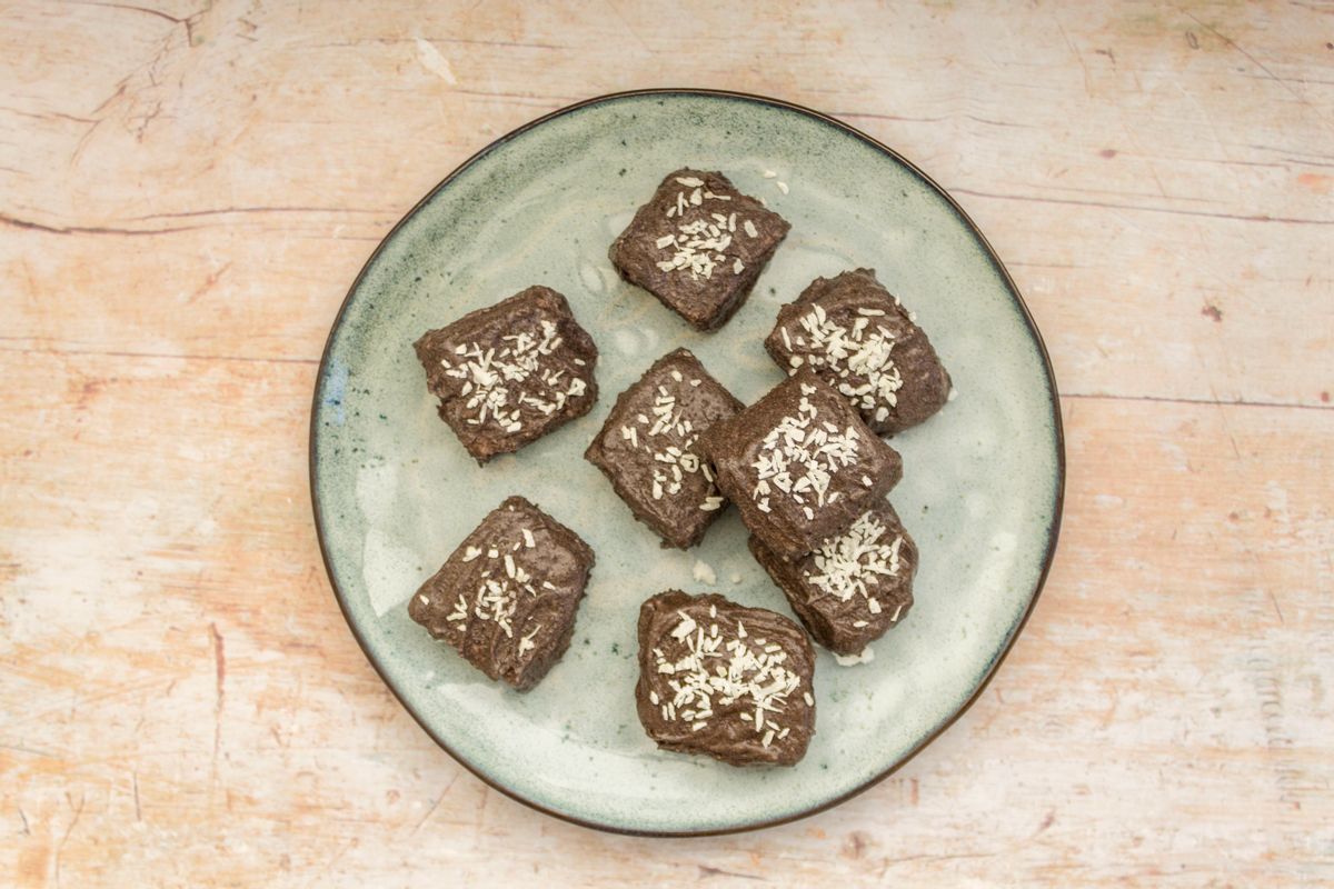 Remove the coconut bar from the freezer and slice into 8 even sized squares.Step 6