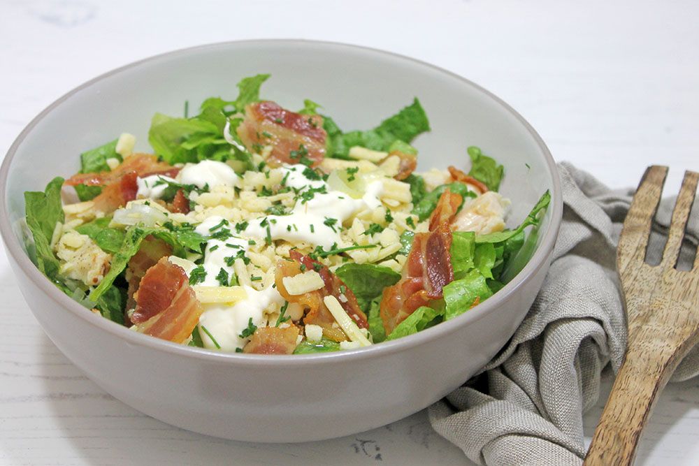 Such a simple to make yet amazing salad. The crunchiness of the bacon along with the chicken and the sour cream makes it a perfect salad combination.