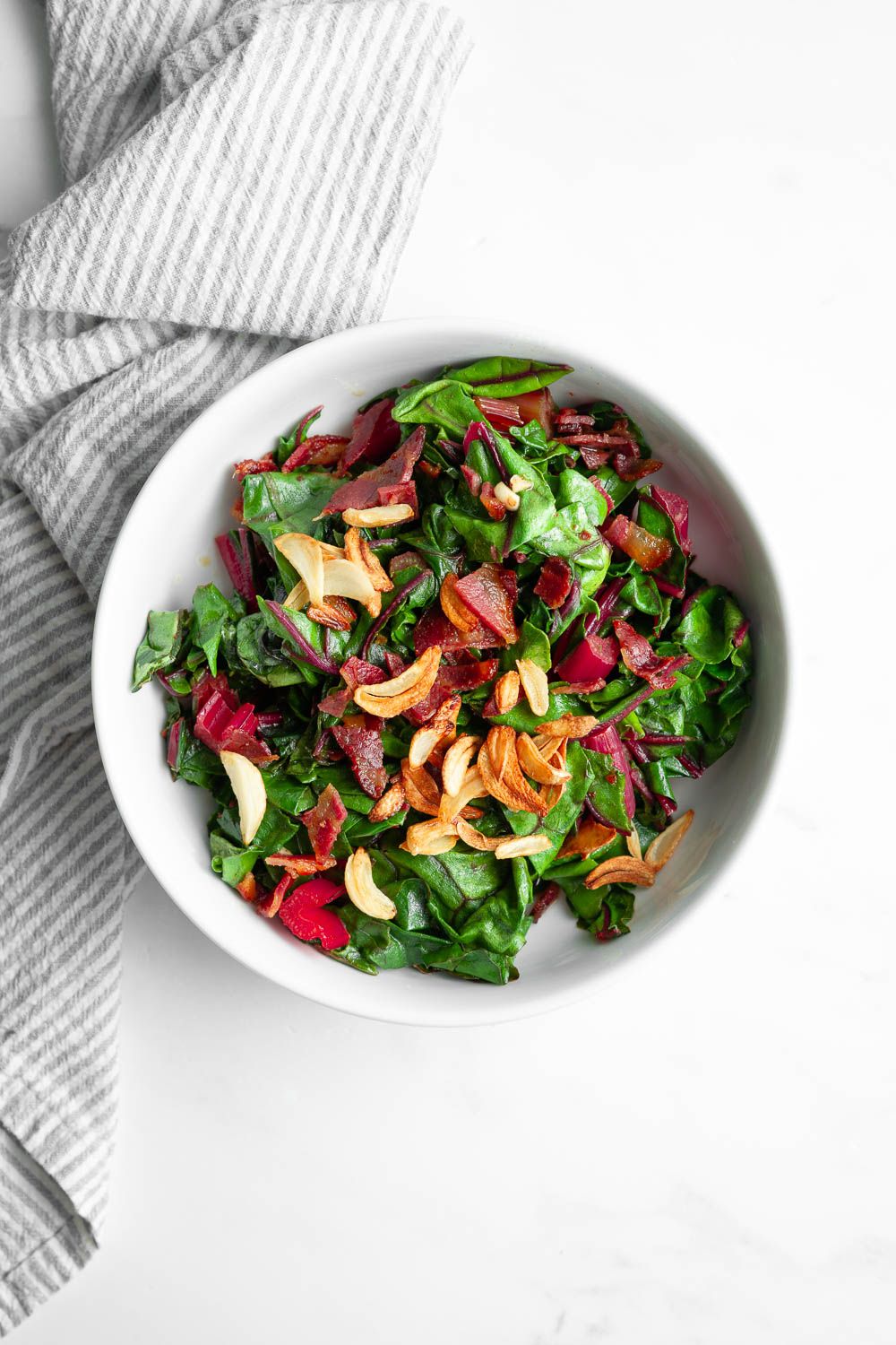 Tasty, garlicky, tender Swiss Chard with spicy, crispy capocollo! Slices of garlic are toasted until crispy and fragrant in olive oil and then set aside. Thin slices of capocollo are crisped in the garlic oil. Finally, chopped and washed Swiss Chard is sauteed in garlic oil until wilted. The cooked Swiss Chard is plated and then topped with crispy, crumbled capocollo and the toasted garlic slices. You will love this simple low carb recipe!