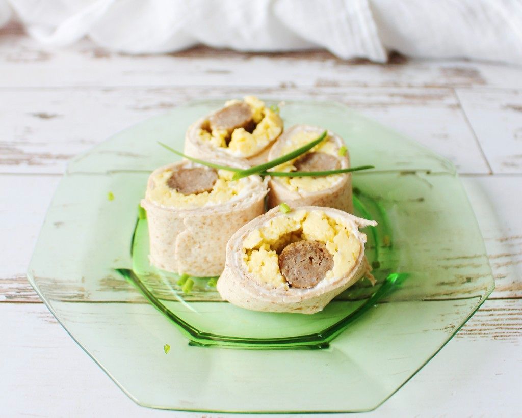 Roll the tortilla over the sausage and eggs then up into a tight roll. Use a sharp knife to remove the ends of the tortilla if necessary. Cut the tortilla into 4-6 pieces (like a sushi roll) to make pinwheels. Enjoy warm for breakfast or as a snack!